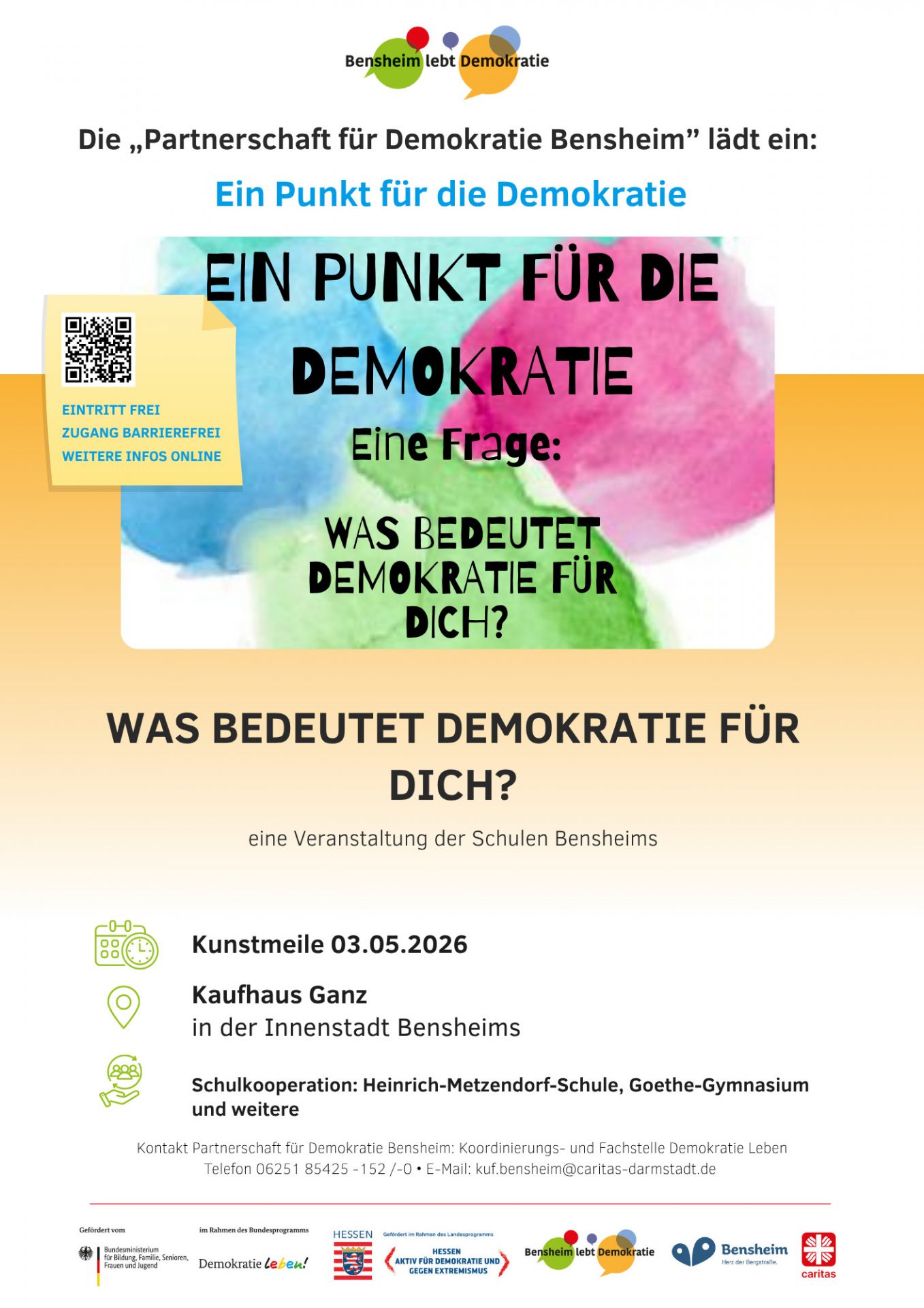 Ein Punkt für Demokratie – eine Schulkooperative, kreative Veröffentlichung zur Kunstmeile in Kooperation mit dem Kaufhaus Ganz. Mitten in Bensheim – direkt bei den Menschen. Von Jugendlichen aus verschiedenen Schulen Bensheims geschaffen, um ihnen den Raum zu geben, für sich selbst zu verdeutlichen, was Demokratie bedeutet.